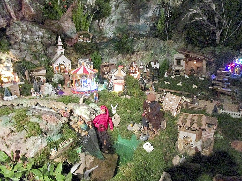 Tout est éclairé, beaucoup de scénettes sont animées ; on imagine sans peine le nombre d’heures de travail nécessaires à une telle réalisation et la patience dont la créatrice et ses aides bénévoles ont fait preuve pour obtenir un tel résultat. Cela pourrait évoquer le travail des bâtisseurs de cathédrale qui ont créé des merveilles pour le bonheur de ceux qui les visitent. C’est peut-être cela aussi la magie de Noël !