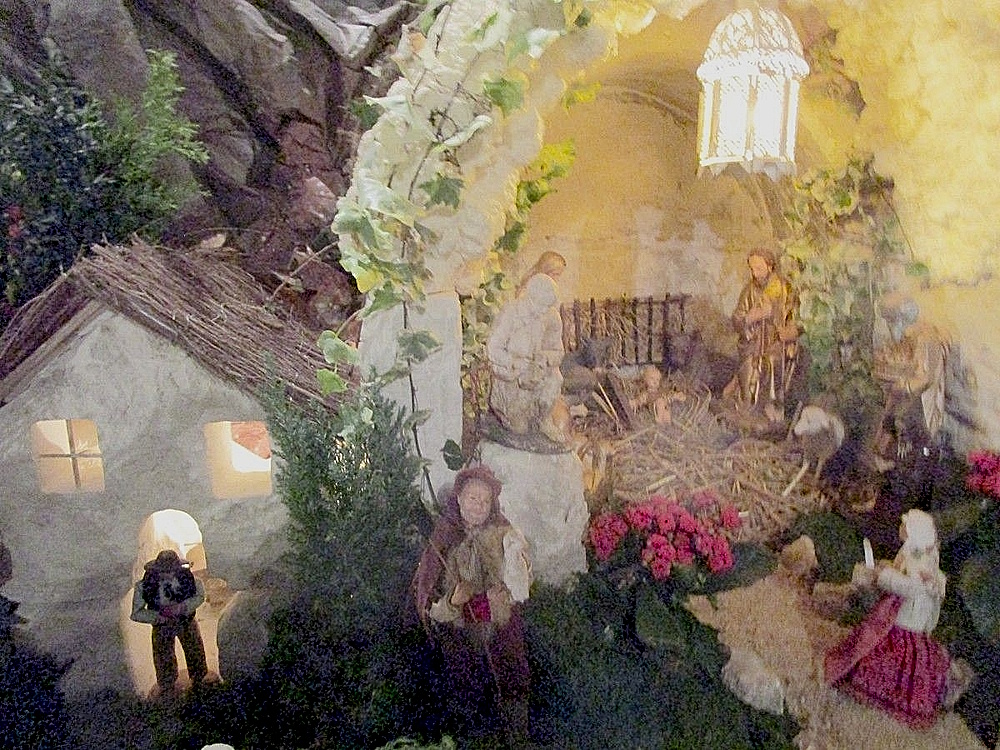 En revenant vers le centre, on trouve la crèche proprement dite, l’Enfant Jésus, saint Joseph, la Vierge Marie, le bœuf et l’âne, les anges et les bergers entourés de nombreux moutons. Avant le 6 janvier, les rois mages ne sont pas encore arrivés.