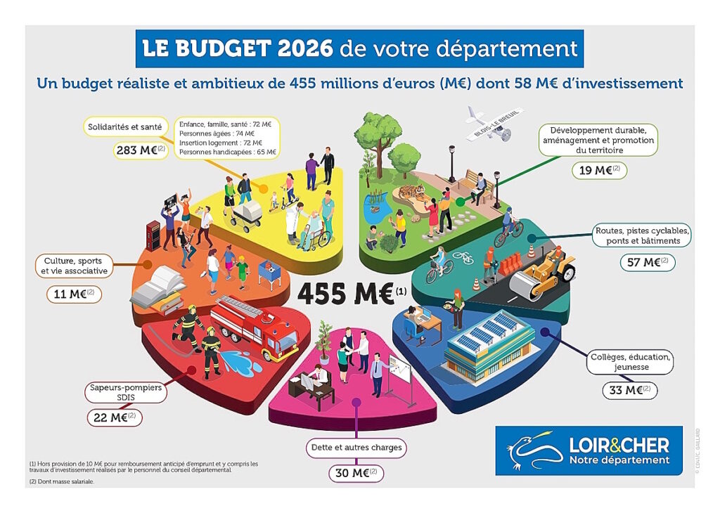 Le Conseil départemental du Loir-et-Cher a fait le choix de maintenir en 2026, un programme important d’aide aux communes et aux communautés de communes dans les secteurs du développement durable, de l’aménagement ainsi que dans celui de la promotion du territoire. Un budget conséquent concerne également l’éducation, la jeunesse, la rénovation des collèges… Les sommes notables allouées aux infrastructures et aux équipements, à la culture, aux sports et à la vie associative marquent un engagement fort et responsable de la collectivité qui soutient également le Service Départemental d’Incendie et de Secours.