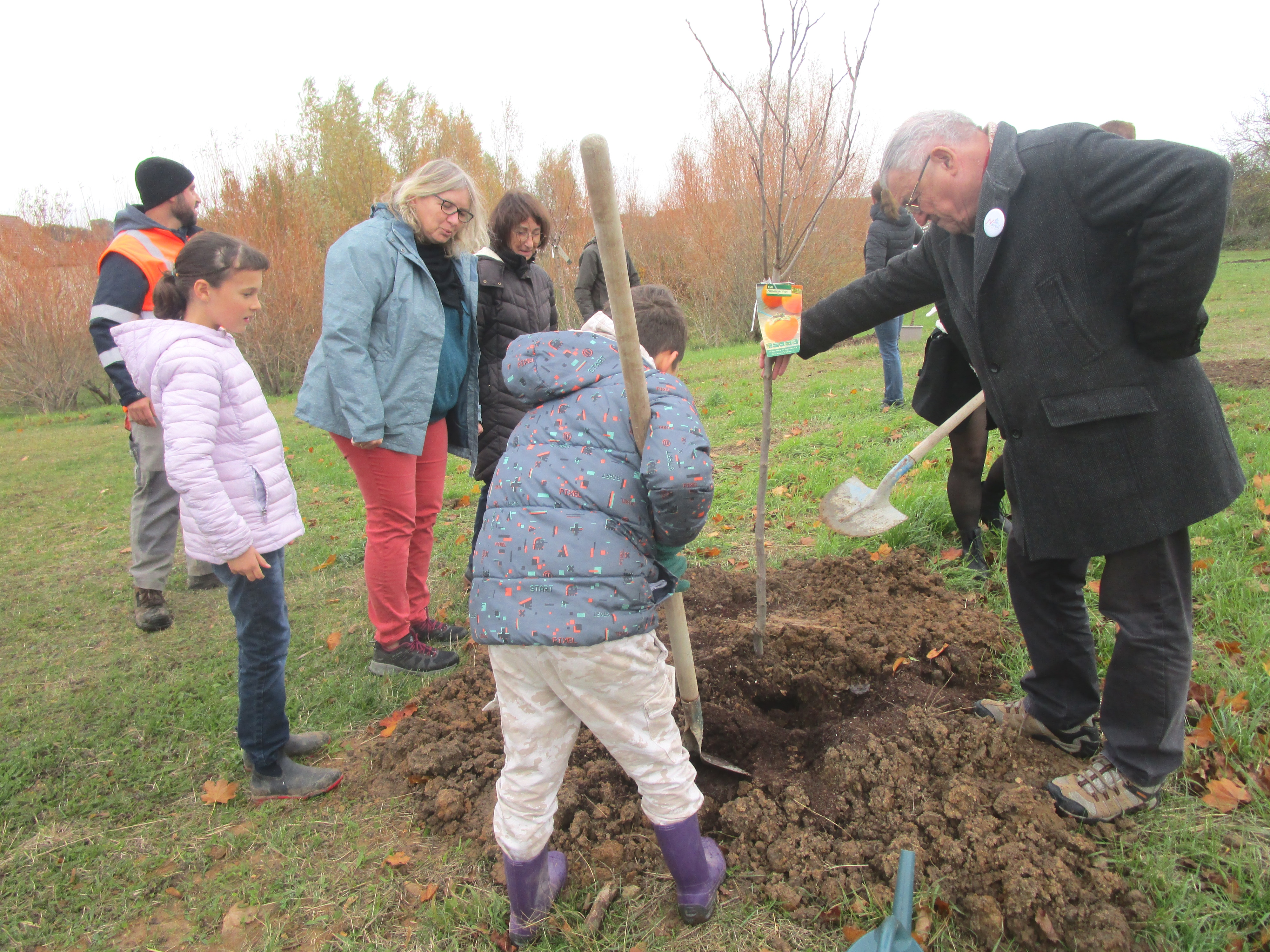 25 enfants ont vu le jour dans la commune durant l’année écoulée ; 25 arbres ont donc été plantés. Les élus ont eu l’excellente idée de choisir des arbres fruitiers ; le futur parcours satisfera les gourmands quelles que soient leurs préférences puisque l’on pourra y cueillir les fruits les plus variés : kakis, amandes, pommes, figues, etc. : un chemin très alléchant ! En ce 11 novembre, Magali Marty et plusieurs membres du conseil accompagnés de l’équipe technique municipale, attendaient les familles pour procéder avec elles à la plantation. Des représentants du Conseil des sages comme du Conseil municipal des jeunes étaient également présents et ont apporté leur aide à la réalisation de l’opération.