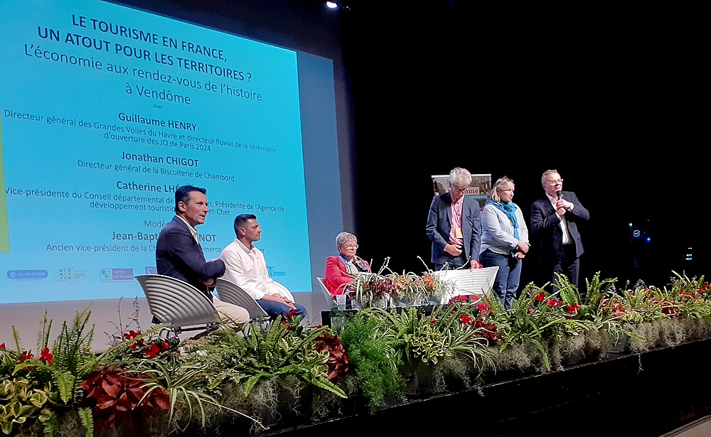 Le 9 octobre, la 7ème édition des Rendez-Vous de l’Histoire à Vendôme avait pour thème « Le tourisme en France, un atout pour les territoires ? » Vincent Le Duff, Sous-Préfet, Christophe Marion, député, Philippe Gouët, Président du Conseil départemental ainsi que Laurent Brillard, maire de la ville ont assisté à la table ronde dont les intervenant étaient, Guillaume Henry, directeur général des Grandes Voiles du Hâvre et directeur fluvial de la cérémonie d’ouverture des JO de Paris, Jonathan Chigot, directeur général de la Biscuiterie de Chambord et Catherine Lhéritier, vice-présidente du Conseil départemental, présidente de l’ADT 41. Magali Marty, vice-présidente de la CATV en charge de l’attractivité économique a chaleureusement remercié Jean-Baptiste Anginot, modérateur, qui, avec son épouse Marie a préparé le débat.