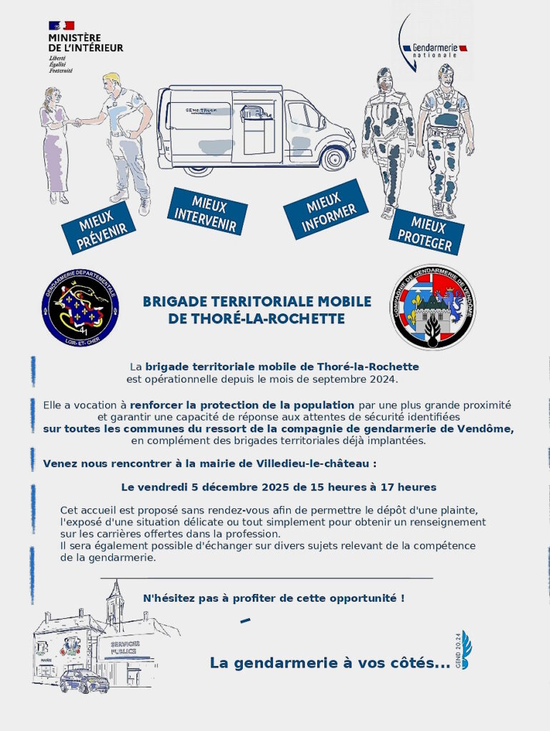 C’est en septembre 2024 qu’a été créée à Thoré-la-Rochette, une Brigade Territoriale Mobile. Les militaires se déplacent en voiture mais ils peuvent également utiliser les vélos qui leur ont été remis, il y a quelques mois, par VALDEM. Cette brigade est dédiée à un service de proximité et entretient des liens étroits avec la population. Les gendarmes savent accomplir leur travail avec bienveillance et fermeté ; ils vont régulièrement à la rencontre les habitants des différents villages qui ne doivent pas hésiter à les informer d’éventuels soucis en matière de sécurité.